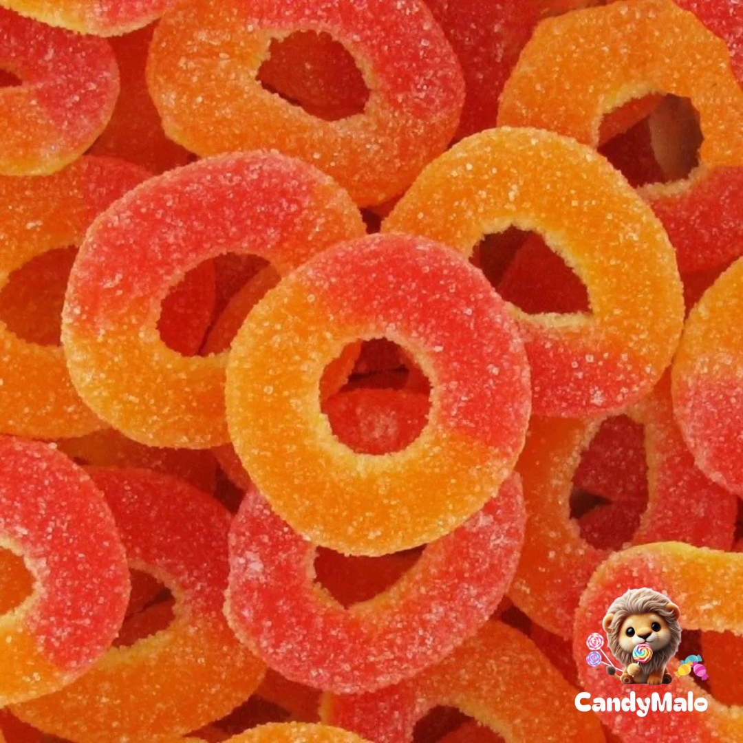 Plongez dans la douceur avec les anneaux pêche : de délicieux bonbons sucrés au bon goût de pêche, a la couleur éclatante orange, pour une explosion fruitée à chaque bouchée. 🍑