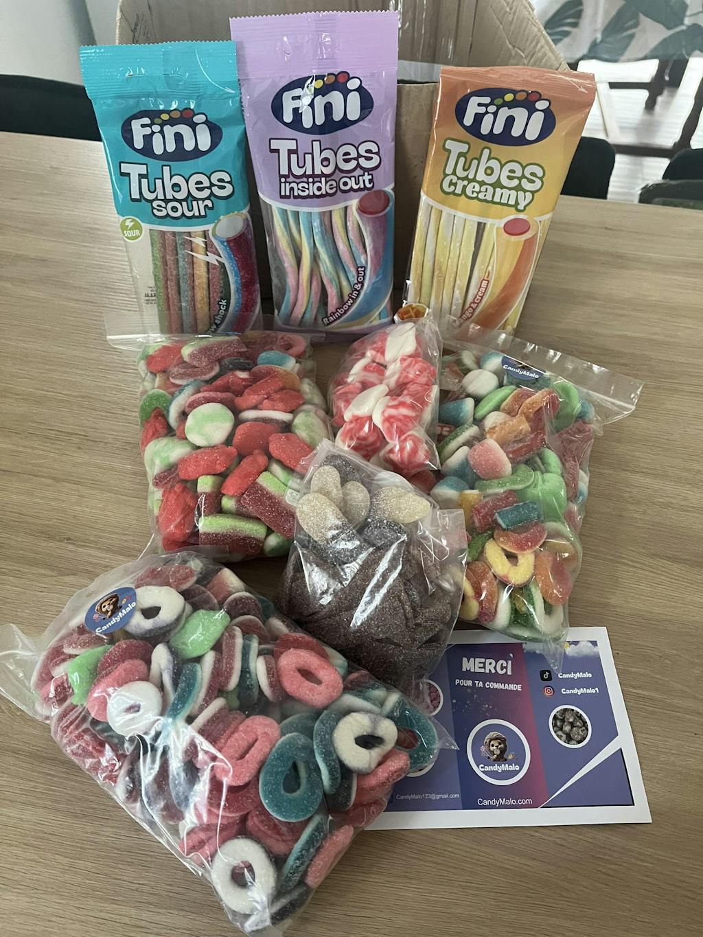 Sucre, farine de blé ( contient du gluten ), sirop de glucose, eau, amidon de Maïs, humectant : glycérine, acidifiants : acide citrique, acide malique, graisse végétales ( palme ), acidifiant : citrate de sodium, arômes, émulsifiant : E471, conservateur : sorbate de potassium, colorant E-150D.