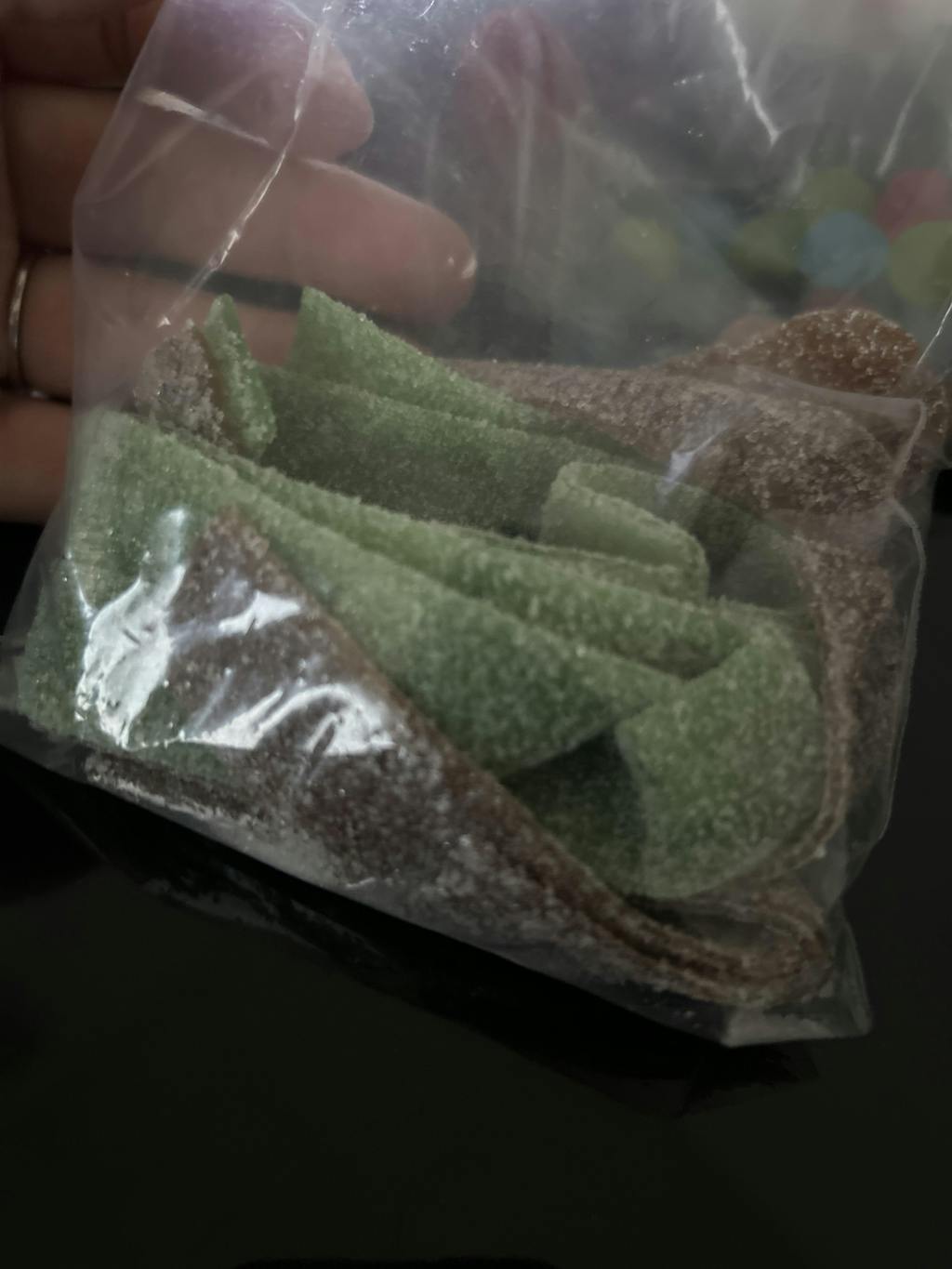 Sucre, Sirop de glucose-fructose, farine de blé, farine de froment, acidifiant (acidie citrique E330, acide malique E296), dextrose, huile végétale (huile de palme), arôme, colorants (E100, E131), antioxydant : acide ascorbique (E306).