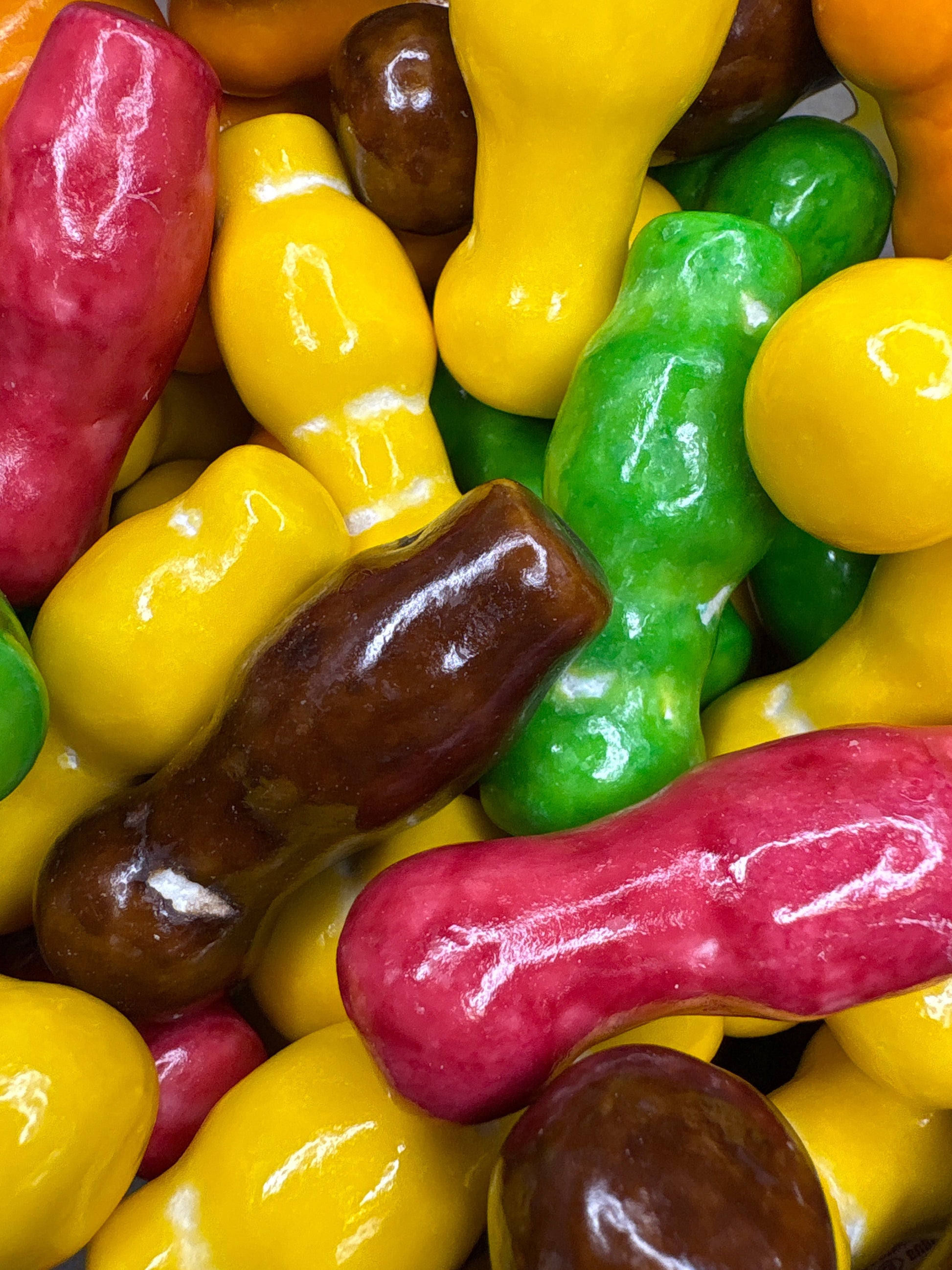 Dextrose, sucre, gomme base, sirop de glucose, acidifiant: acide citrique; arômes, glycérine, amidon modifié, colorants E133, E150d, E160a, concentré de carotte noire, agents d'enrobage : E903 E904, antioxygène E321 sans gluten. Halal
